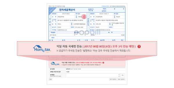 전자세금계산서 발행과 동시에 전송이 되는 홈택스와 달리 팝빌은 발행 후 다음날 오후 3시에 자동으로 국세청에 전송하고 있습니다. 익일 전송이 가능하기 때문에 세금계산서가 국세청으로 전송되기 전까지는 별도의 수정세금계산서를 발행하지 않더라도 발행취소가 가능한 장점이 있습니다.