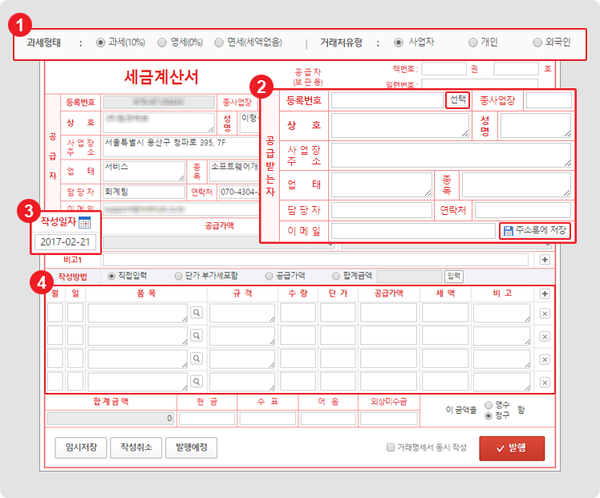 - 재화나 용역의 공급시기에 맞게 작성일자를 선택합니다. 공급시기가 속하는 다음달 10일 이후 발행 시 지연발급 가산세 및 미발급 가산세 대상이 됩니다.