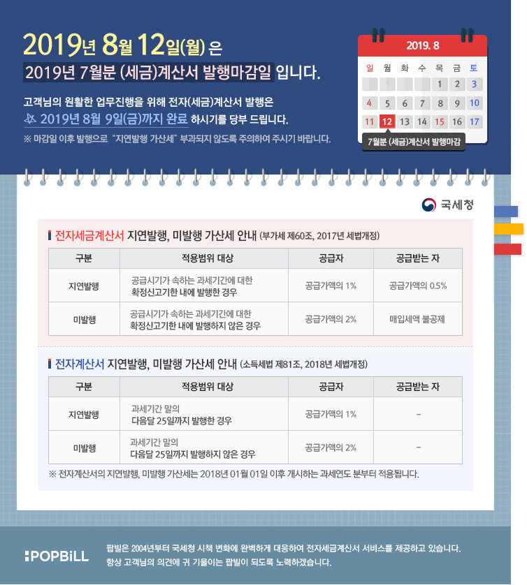 2019년 7월 귀속분 전자세금계산서 발행마감일은 2019년 8월 12일(월)입니다.